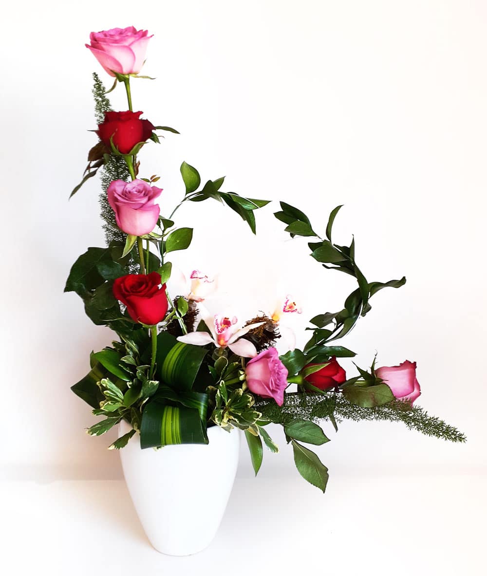 Hermoso diseño floral con vibrantes rosas y elegantes orquídeas en base de cerámica. *Diseño de temporada, pregunta existencia.