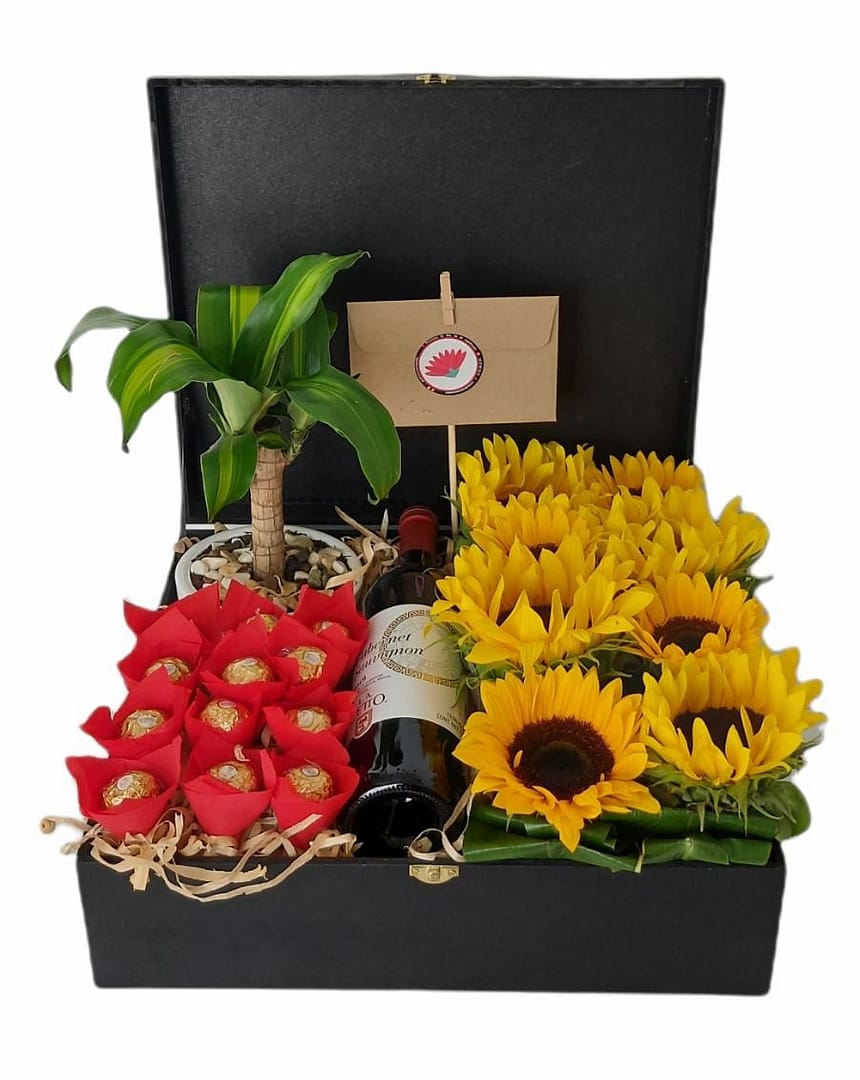 ¡Diseño floral que l@ sorprenderá de sobremanera! bellos y luminosos girasoles acompañados con deliciosos chocolates, vino tinto y un hermoso palo de brasil en maceta.