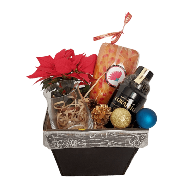 Mini arcón navideño con corajillo, vaso de cristal, panque gourmet, mini nochebuena, base de madera y adornos navideños.