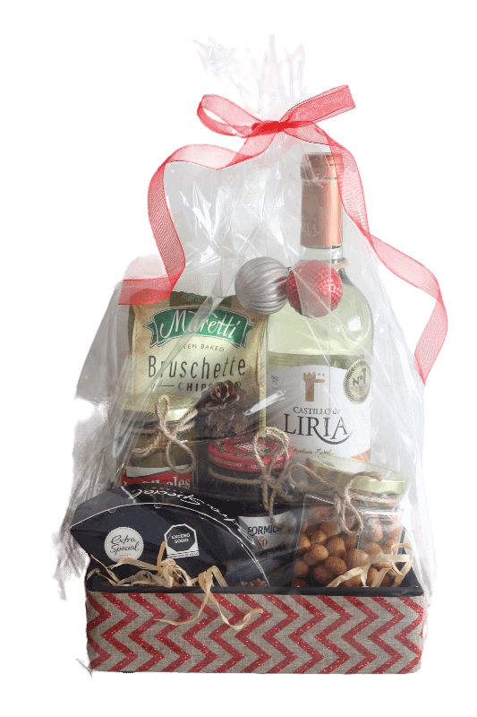 Mini arcón navideño con vino blanco, pan horneado, mermelada, aceitunas, queso Brie, frasco con botana, base de madera y adornos navideños.