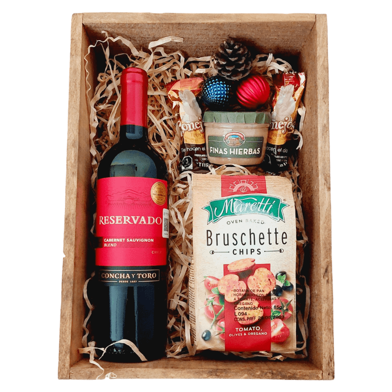 Mini arcón navideño con vino tinto (según