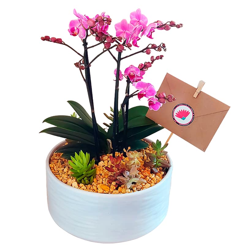 ¡Elegante y muy duradero! diseño realizado con hermosa orquídea y suculentas, ¡éxito y sonrisas garantizadas!