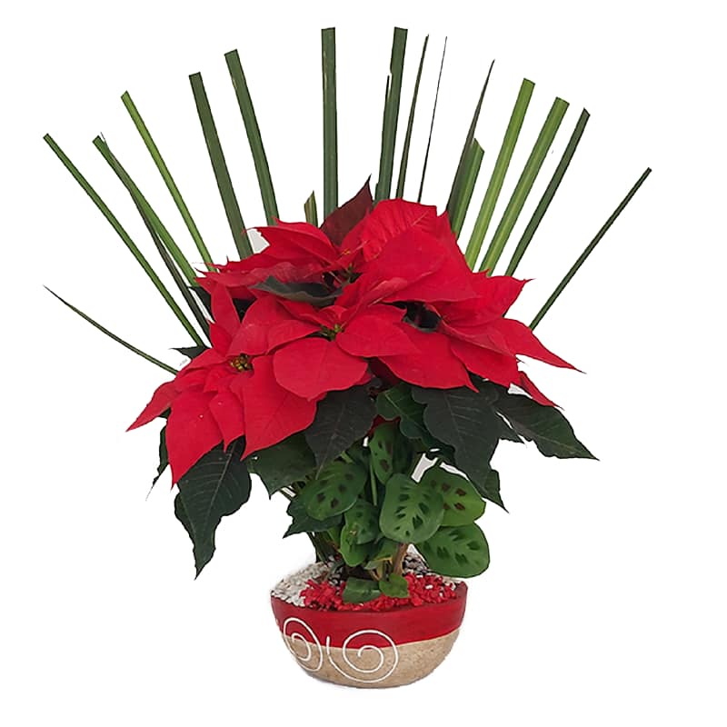 Hermosa nochebuena acompañada de una linda plantita sobre base de barro.