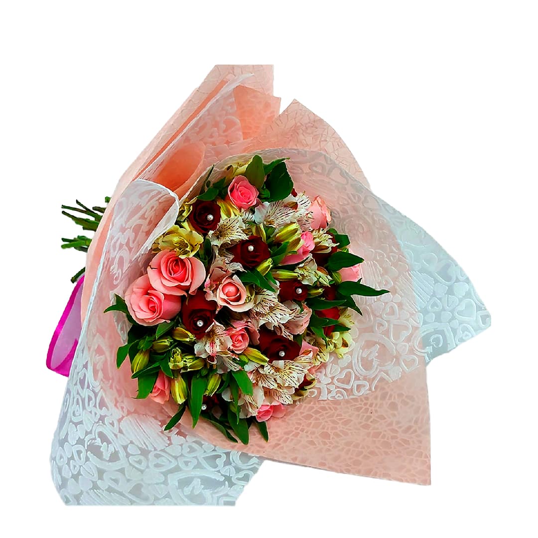 Ramo de 24 rosas rojas, rosas y alstroemerias, detalles de pines decorativos